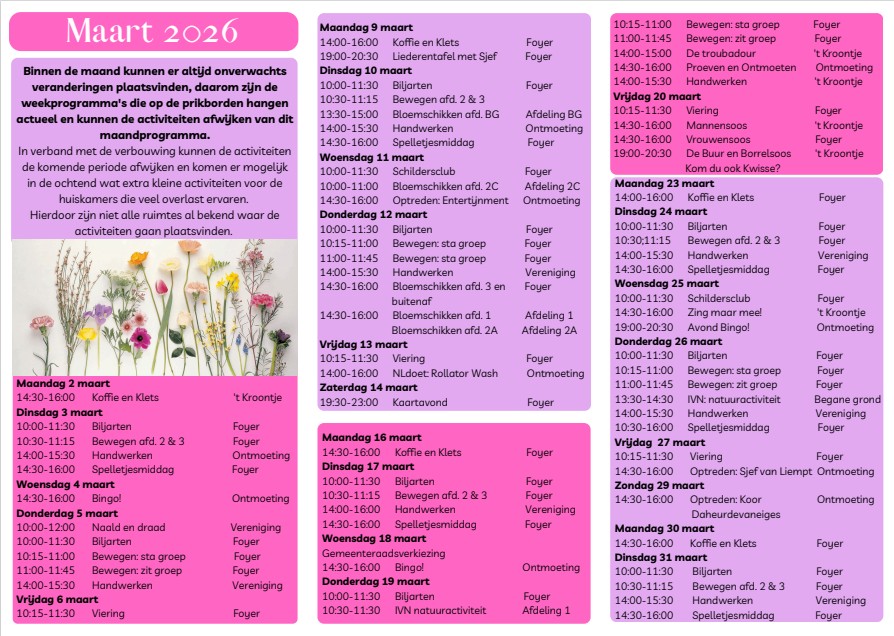 De ontmoetingsruimte (foyer) van de Noorderkroon bruist van de activiteiten. Medewerkers van BrabantZorg en een groep vrijwilligers zorgen elke maand weer voor een volle activiteitenkalender. Bingo, muziek, schilderen, borrelavond, kaarten, noem maar op. Er is van alles te doen. En niet alleen voor de bewoners van de Noorderkroon.