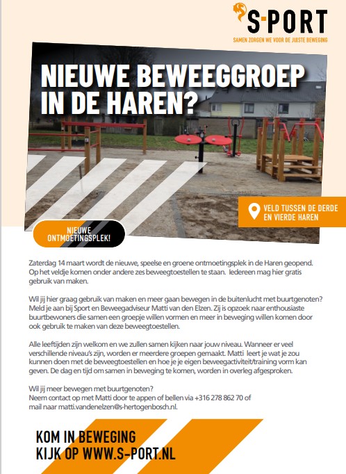 Zaterdag 14 maart wordt de nieuwe, speelse en groene ontmoetingsplek in De Haren geopend. Op het veldje staan zes gloednieuwe beweegtoestellen te wachten op jullie. Iedereen mag hier gratis gebruik van maken. Wil jij hier aan de slag; samen met je buurtgenoten lekker gaan bewegen in de buitenlucht? Meld je dan aan bij Sport en Beweegadviseur Matti van den Elzen. Zij is op zoek naar enthousiaste buurtbewoners die samen een groepje willen vormen en meer in beweging willen komen door ook gebruik te maken van deze beweegtoestellen.